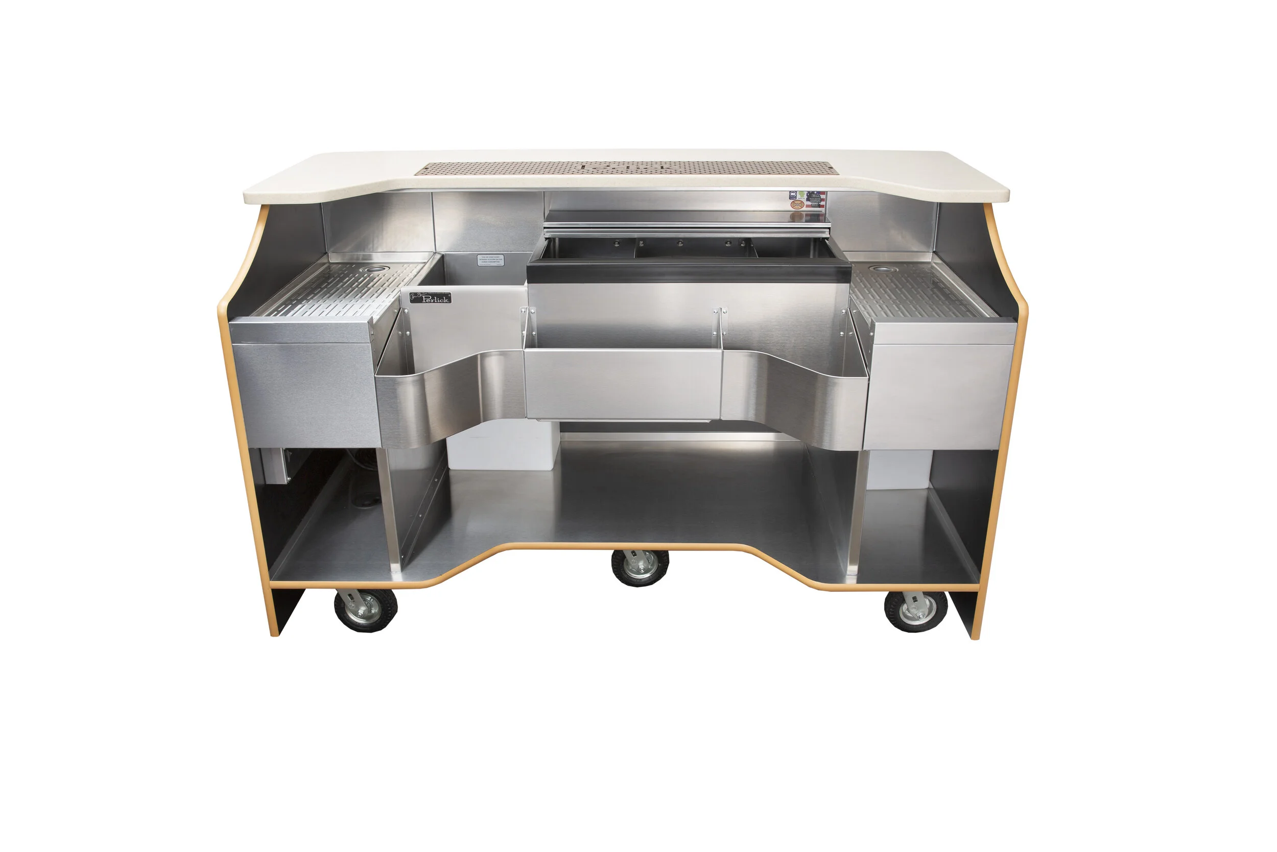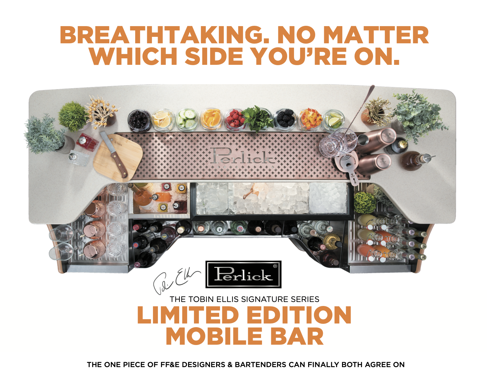 The most requested piece of underbar equipment since we launched the Tobin Ellis Bartenders’ Cockpit by Perlick… is finally here. A high-performance, luxury mobile bar finished in eco-friendly, luxury recycled leather in toffee crocodile and topped with an ergonomic cockpit-shaped solid-surface bar top in vanilla sugar. With upgrades like LED task lighting and a custom double-wide drink rail in a beautiful antique copper finish. It’s the mobile bar you’ve been asking for, available in limited quantities. Finally— the one piece of FF&E designers and bartenders can both agree on. Contact your Perlick rep today for specs, pricing, and availability.